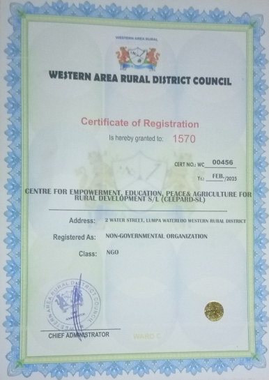 CEEPARD Sierra Leone is a not for profit making Non Governmental Organization (NGO) which has been in operations as a registered Community Based Organization (CBO) since 2021 to 2024. As of February, 2025, the Organization had gained registration as a Non governmental Organization with the Western Area Rural District Council in the Western Area Rural District headquarters, Waterloo. This means, CEEPARD Sierra Leone can now operates in more than one districts in Sierra Leone. It was established as a rural integrated organization to foster Charitable and voluntary Rural Development Initiatives related to the welfare of Vulnerable Children, Youths and Women through Economic Empowerment programs, Equal access to quality Education, Agricultural support to small holder farmers, Peace-building advocacy, and Livelihood Support activities to alleviate extreme poverty in rural communities in Sierra Leone. CEEPARD Sierra Leone does so by creating earth breaking opportunities in deprived rural communities to enhance the livelihood of the needy by outsourcing opportunities from all, and to ensure equality for all.