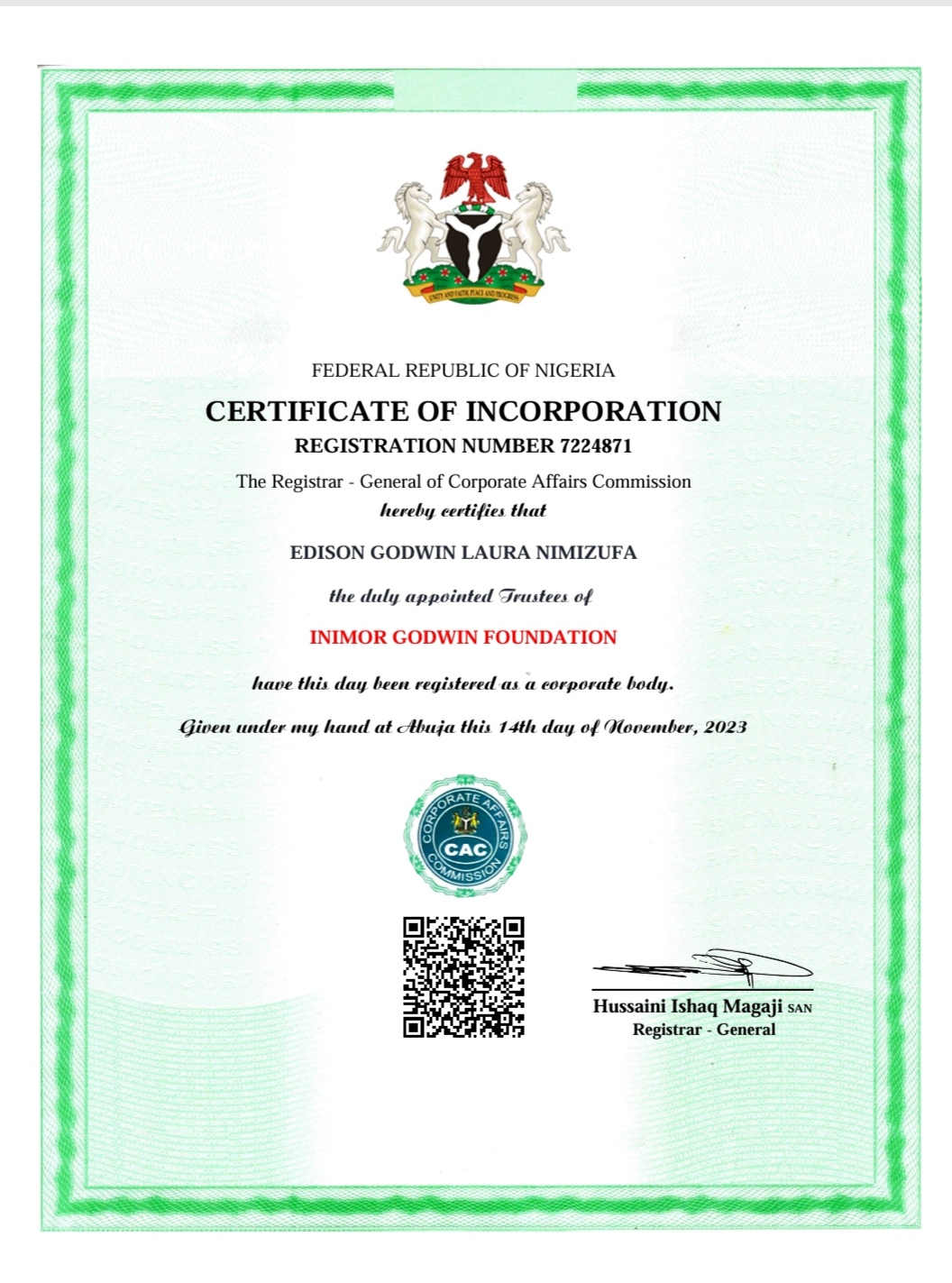 Inimor Godwin’s Foundation is a NGO dedicated to helping and empowering the needy. The Foundation is involved in fundraising activities, aiming to support orphans, widows, and young adults in need.